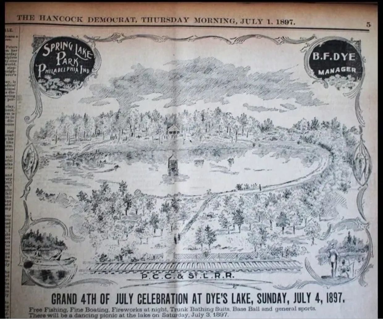 Newspaper Clipping from the Hancock Democrat July 1, 1897 announcing a Grand July 4th celebration and a dancing picnic at Spring Lake Park, Philadelphia Indiana.
