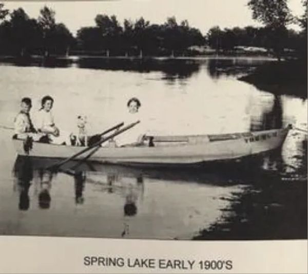 The gem of Sugar Creek Township, Spring Lake, was originally a deep gully combining a number of natural springs. In 1884, William Dye, constructed a dam across it's west end and made it into an artificial lake. Known as Dye's Grove because of the beautifully wooded shores, it featured a passenger steamer able to carry about thirty persons. Employees of the Pan Handle Railroad Company picnicked here in 1886. In that same year, a camp meeting was held on its grounds which resulted in the organization of the congregation of Friends of Philadelphia.